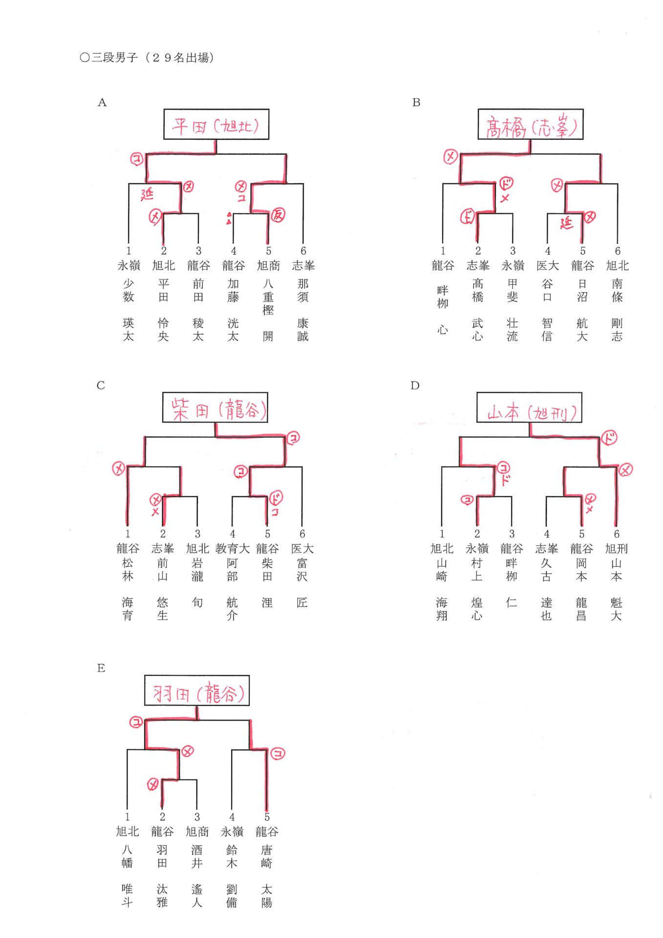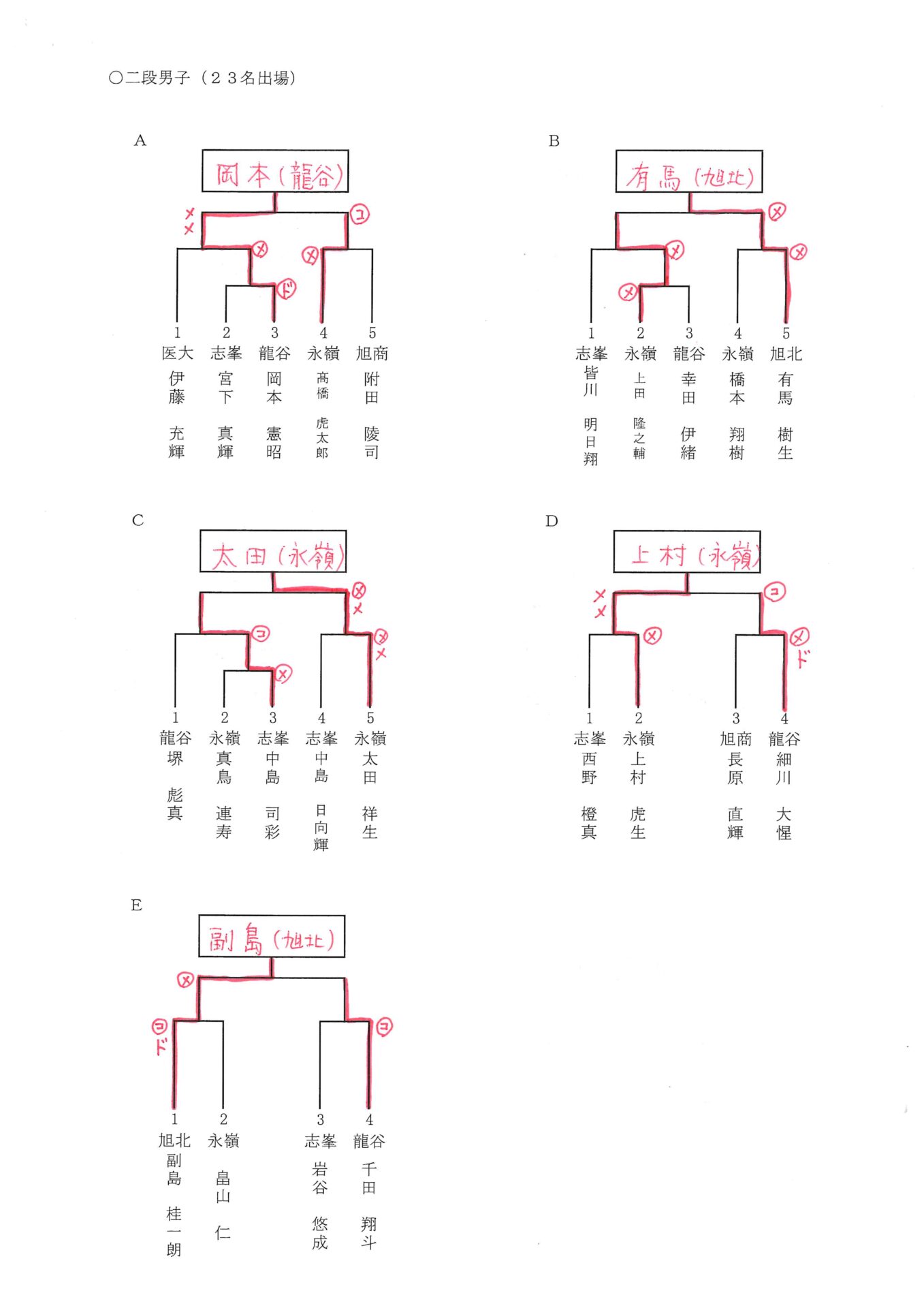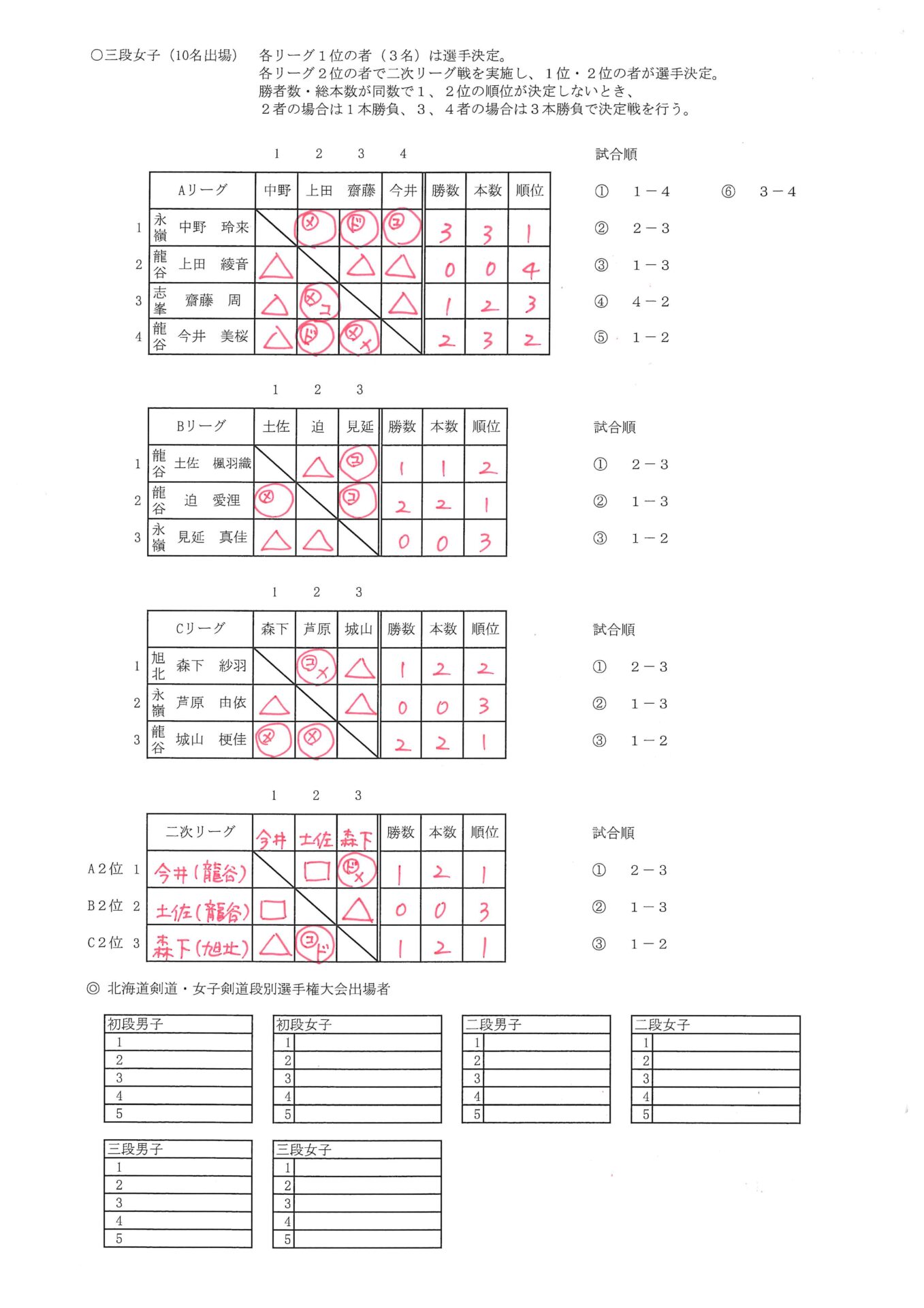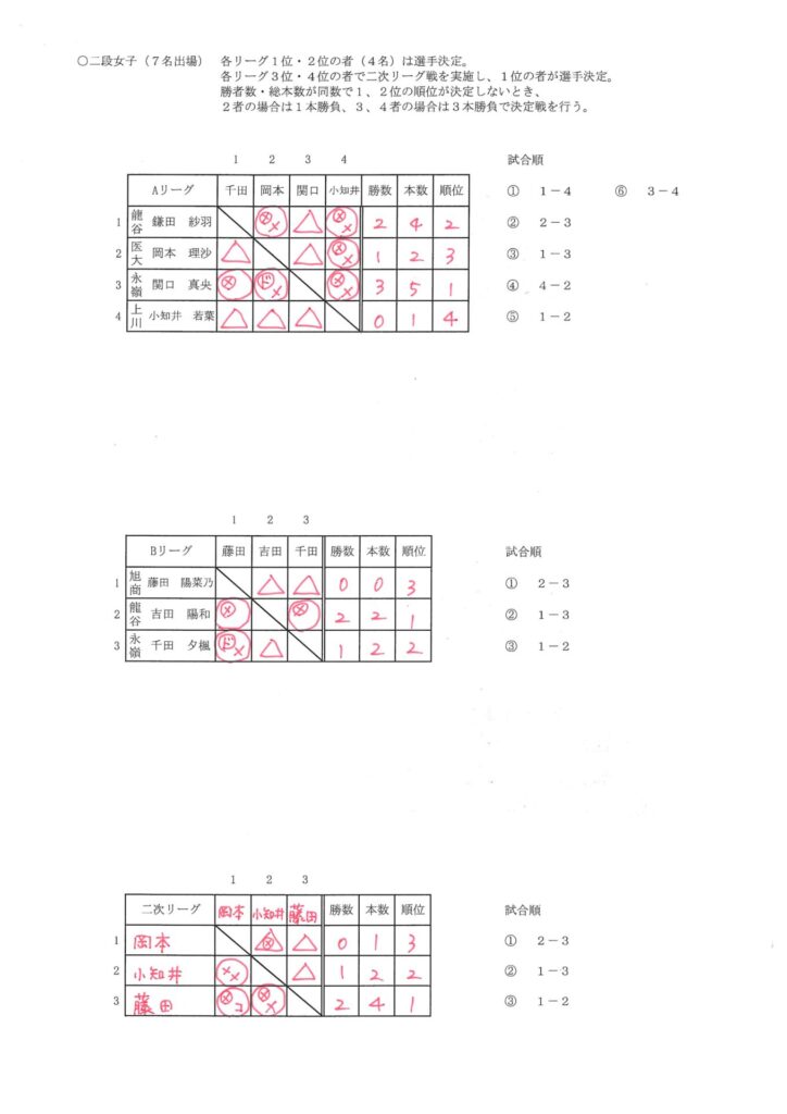 初段男子、初段女子は、5名以内の申し込みのため、予選の試合はなく、そのまま代表選手に決定。